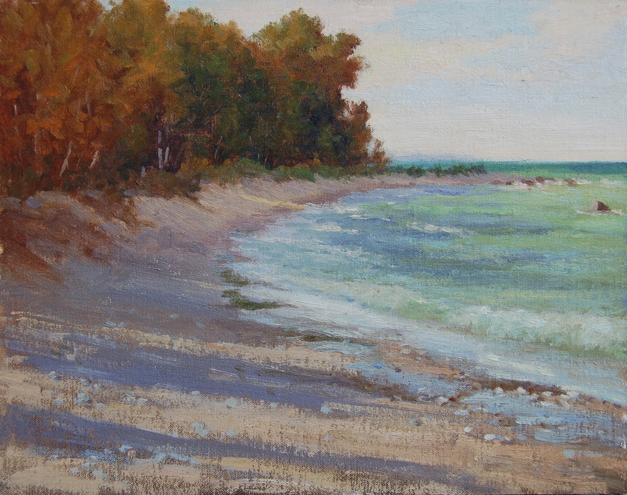 | Cove in Morning, oil, 11x14 Grand Traverse Bay. I loved the water color and fascinated by the color changes on the water with the morning shadows. |